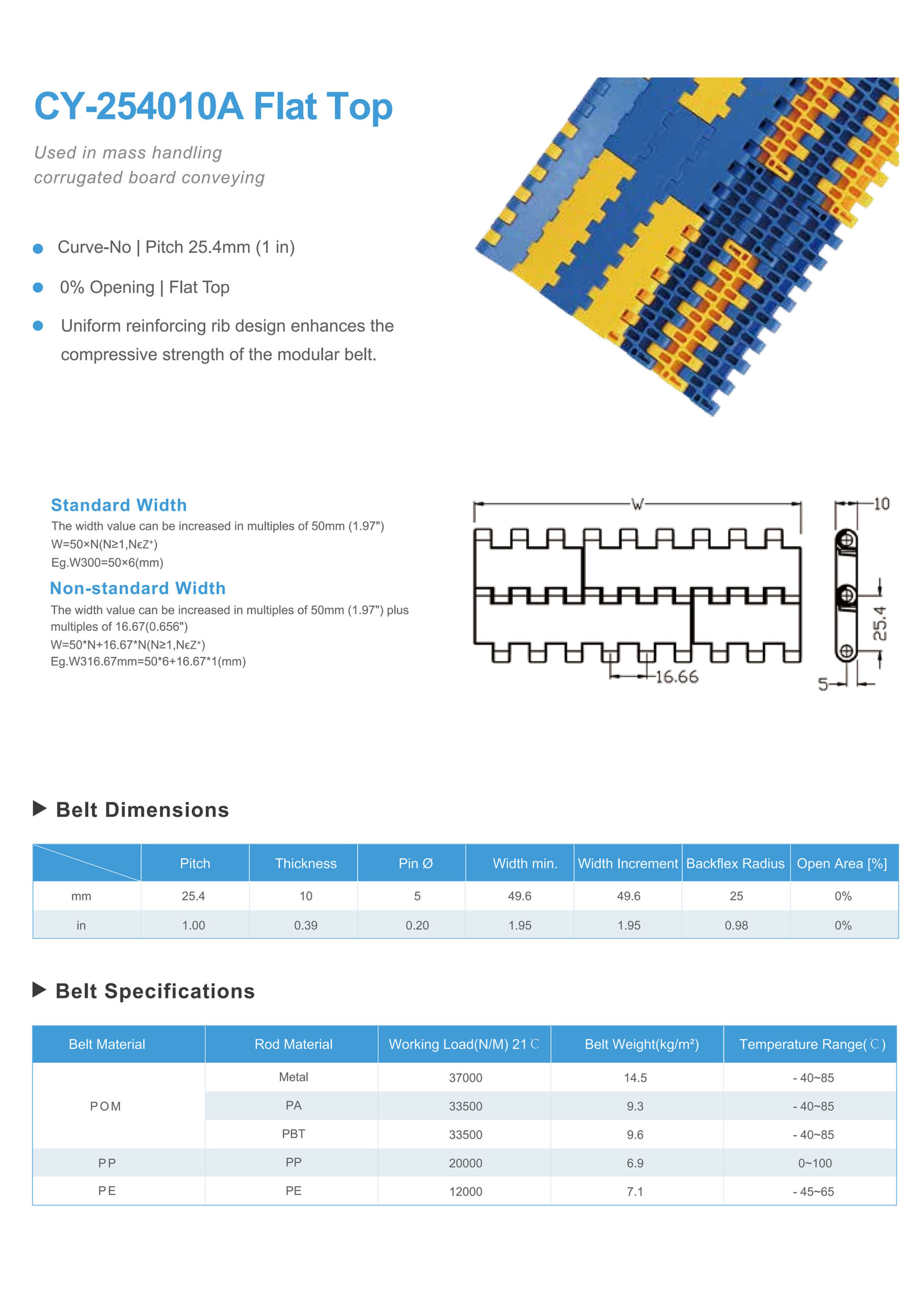 | Belt Material | Rod Material | Working Load(N/M) 21 ℃ | Belt weight(kg/㎡) | Witdth of single Module(mm) | Width increment (mm) |
